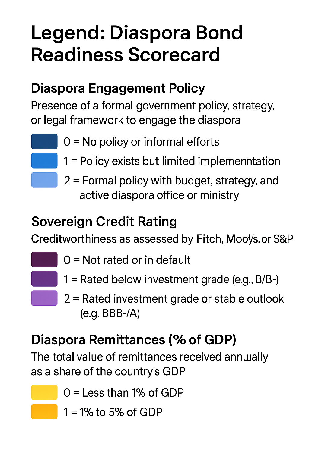| Country | S&P Credit Rating | Outlook | Diaspora Engagement Policy (0-2) | Sovereign Credit Rating (0-2) | Diaspora Remittances (% of GDP) (0-2) | Total Readiness Score (0-6) | Readiness Category |
