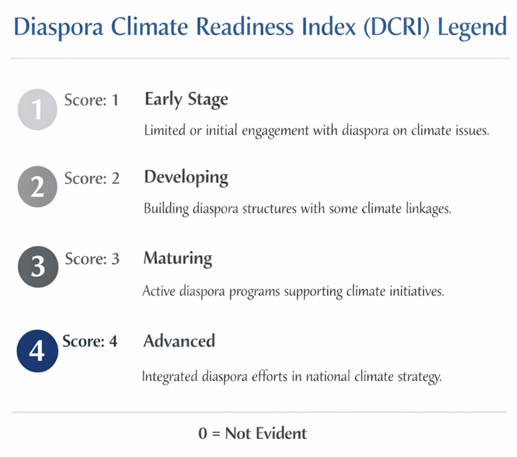 • DCRI scoring is informed by qualitative analysis of publicly available data, institutional evidence, and observable engagement mechanisms related to diaspora and climate activity.